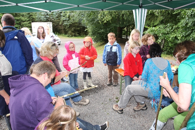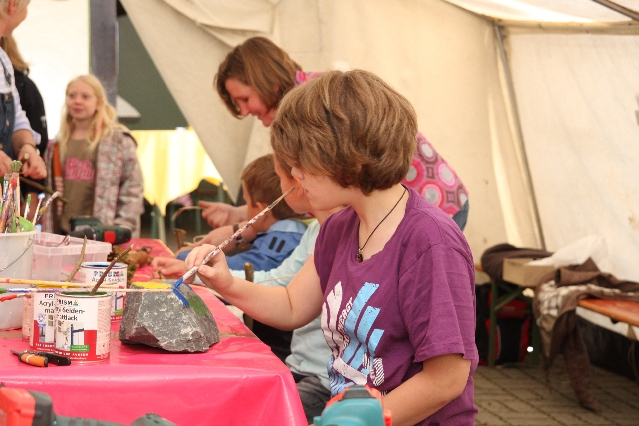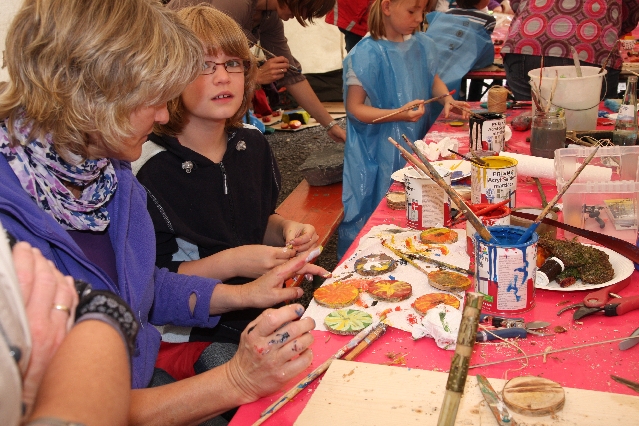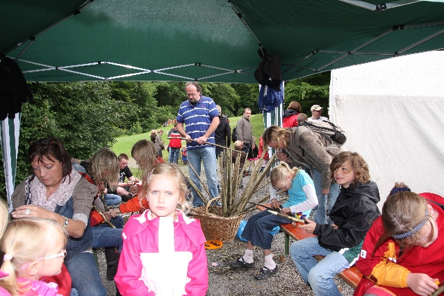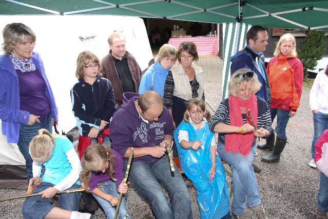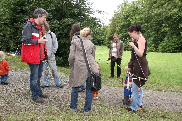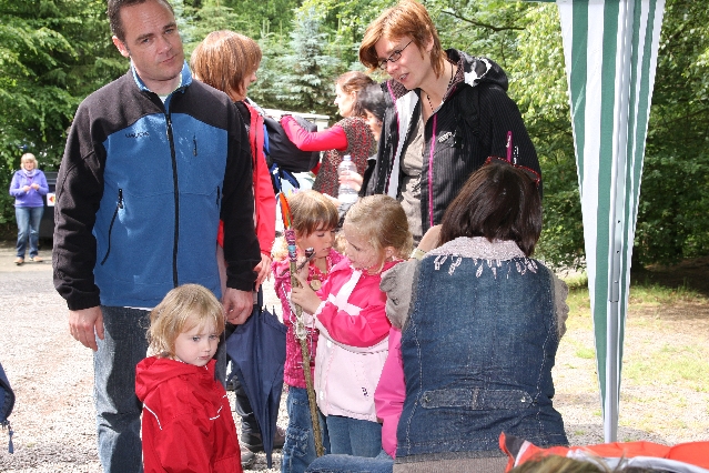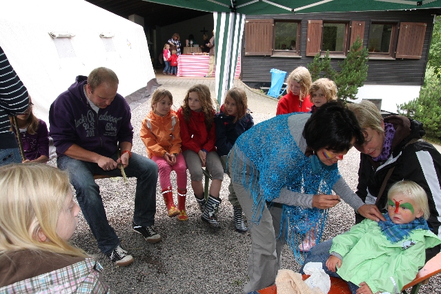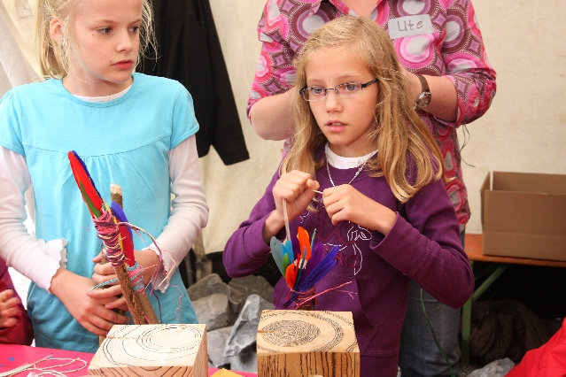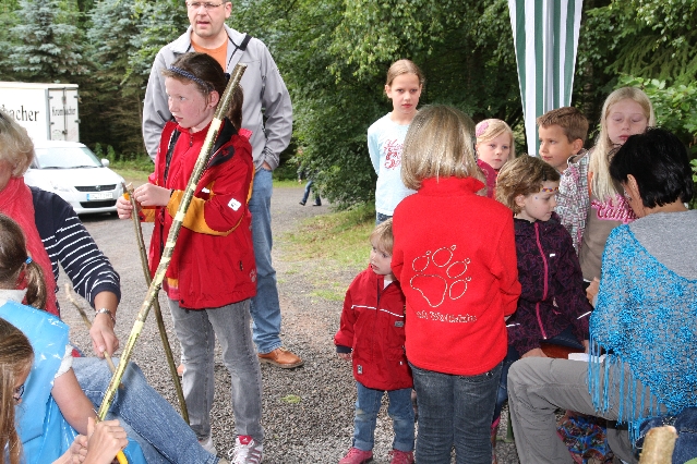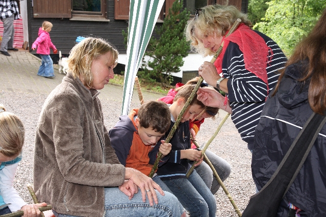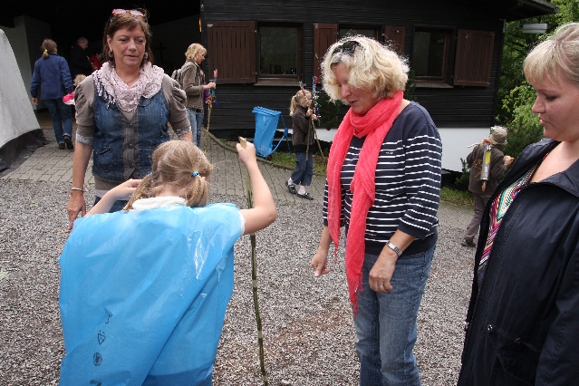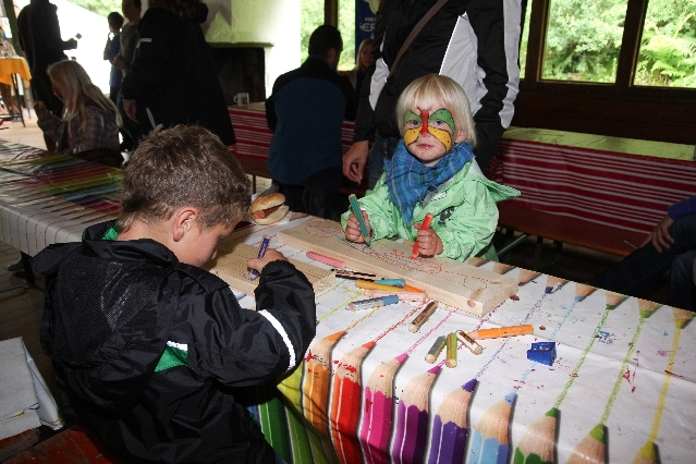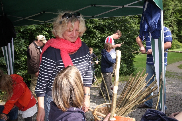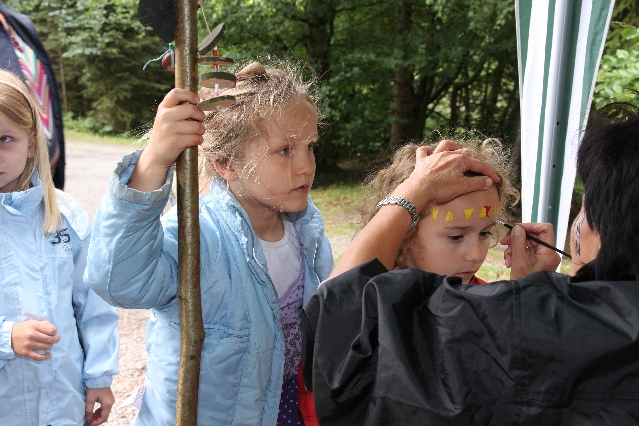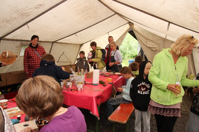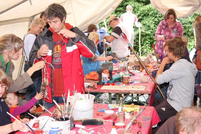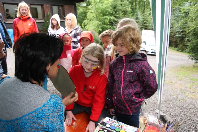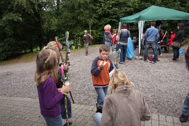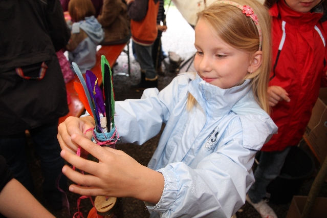 Sorgen haben sie sich gemacht, die Veranstalterinnen des KuLTour-Aktiv-Tages in Drolshagen Kalberschnacke am Listersee. Es sollte regnen, und das ist nun wirklich keine gute Voraussetzung für ein Open-Air-Event. Aber es ist ja gut gegangen, sogar sehr gut. Viele Besucher, Erwachsene und Kinder, hatten viel Spaß bei den Workshops, die am letzten Donnerstag am wunderschönen Kunst-Wanderweg am Listersee angeboten wurden. Da wurde geschnitzt, gemalt, geklebt und gestaltet. Zwischendurch mal schnell eine Stärkung: Würstchen oder Kuchen… und gleich wieder weitergearbeitet. Wer es lieber ruhiger wollte, ist die 7 km KuLTour-Weg gewandert und konnte dabei an einem Quiz teilnehmen und einen 50 Euro-Gutschein der Aktionsgemeinschaft Drolshagen e.V. gewinnen. Am Ende liefen viele kleine „Indianerkinder“ in „Friedens“-Bemalung und mit Zauberstäben johlend über die Wiesen, und auch die Eltern waren restlos zufrieden.