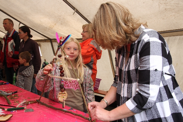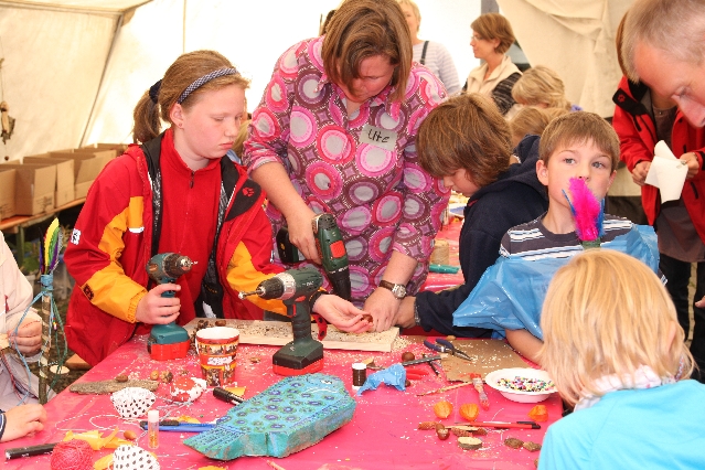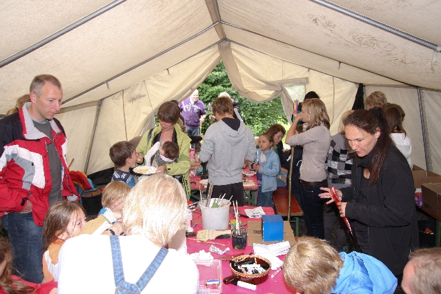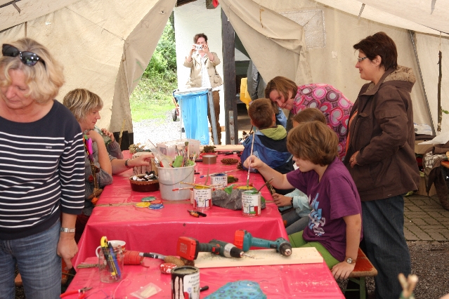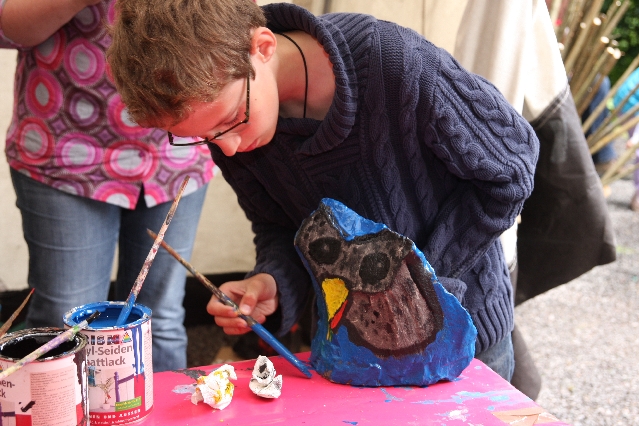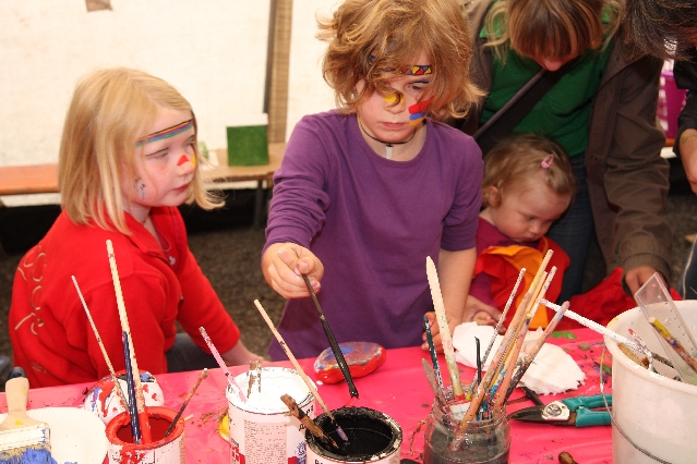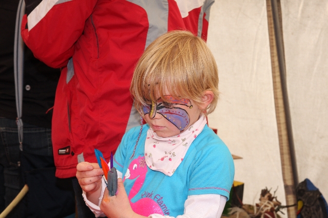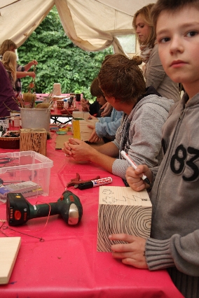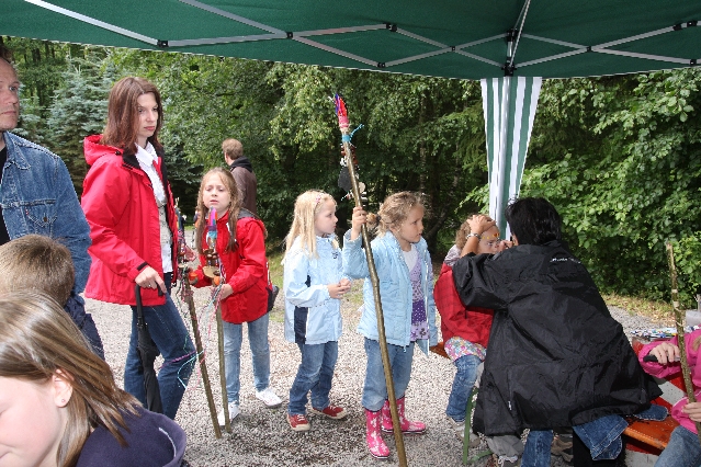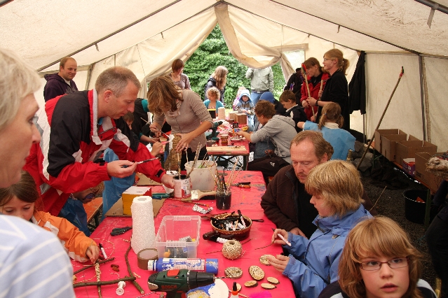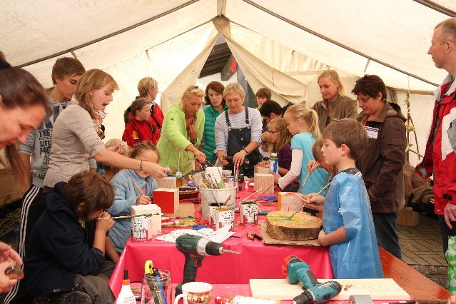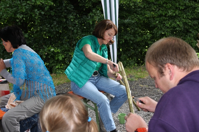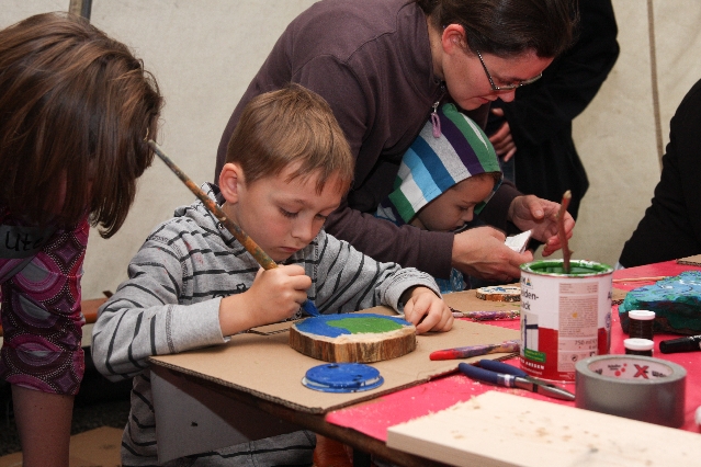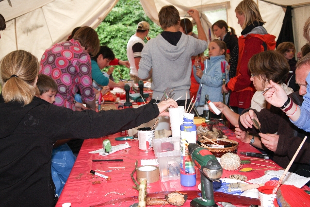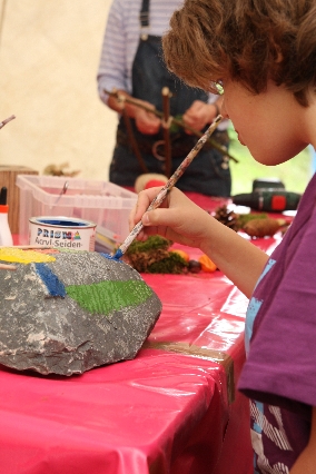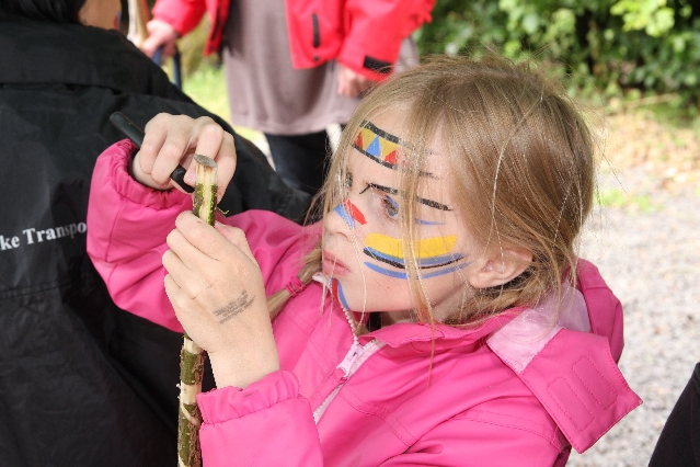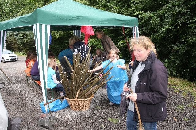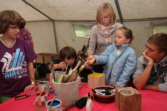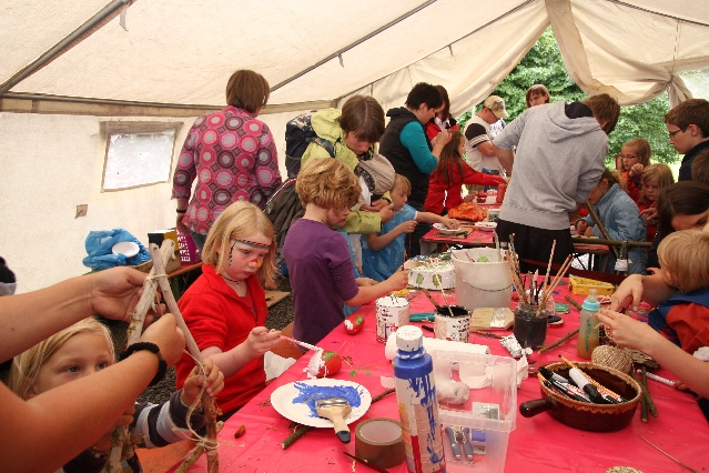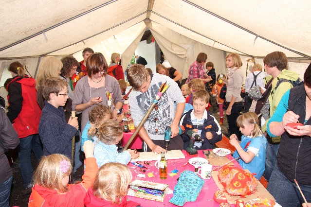 Sorgen haben sie sich gemacht, die Veranstalterinnen des KuLTour-Aktiv-Tages in Drolshagen Kalberschnacke am Listersee. Es sollte regnen, und das ist nun wirklich keine gute Voraussetzung für ein Open-Air-Event. Aber es ist ja gut gegangen, sogar sehr gut. Viele Besucher, Erwachsene und Kinder, hatten viel Spaß bei den Workshops, die am letzten Donnerstag am wunderschönen Kunst-Wanderweg am Listersee angeboten wurden. Da wurde geschnitzt, gemalt, geklebt und gestaltet. Zwischendurch mal schnell eine Stärkung: Würstchen oder Kuchen… und gleich wieder weitergearbeitet. Wer es lieber ruhiger wollte, ist die 7 km KuLTour-Weg gewandert und konnte dabei an einem Quiz teilnehmen und einen 50 Euro-Gutschein der Aktionsgemeinschaft Drolshagen e.V. gewinnen. Am Ende liefen viele kleine „Indianerkinder“ in „Friedens“-Bemalung und mit Zauberstäben johlend über die Wiesen, und auch die Eltern waren restlos zufrieden.