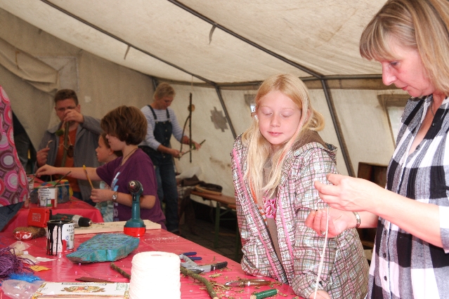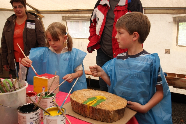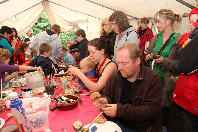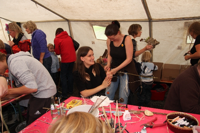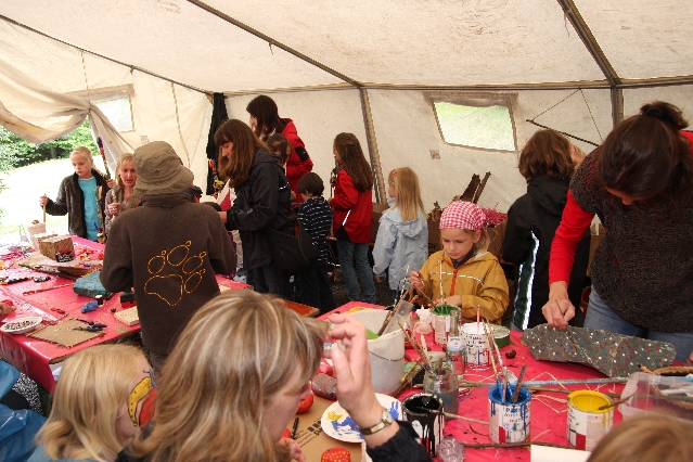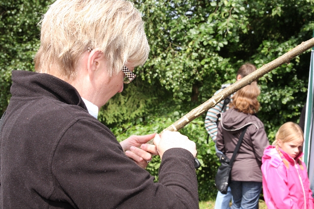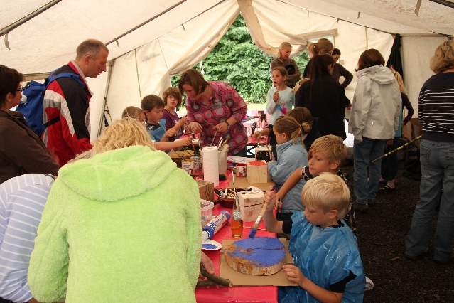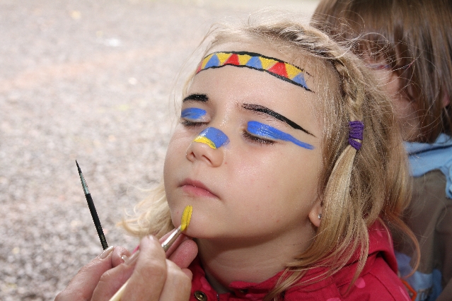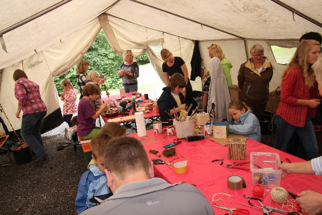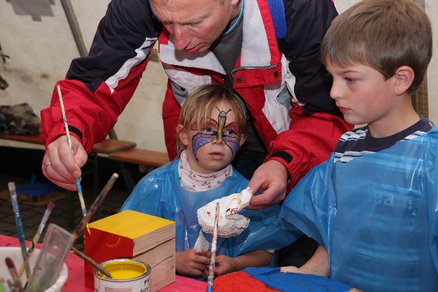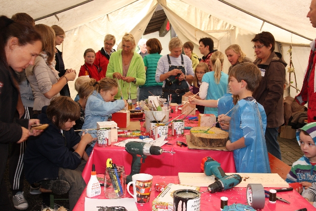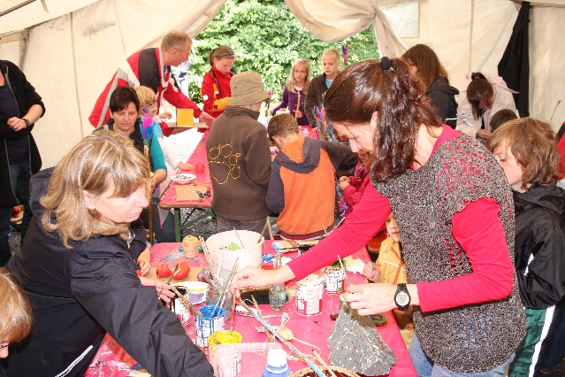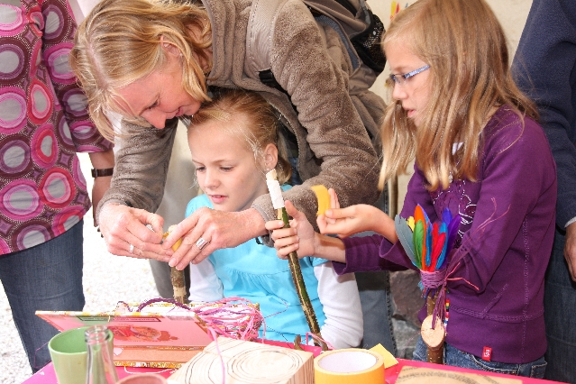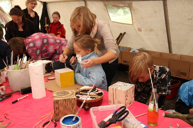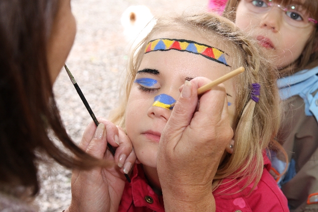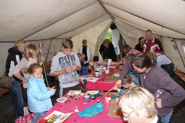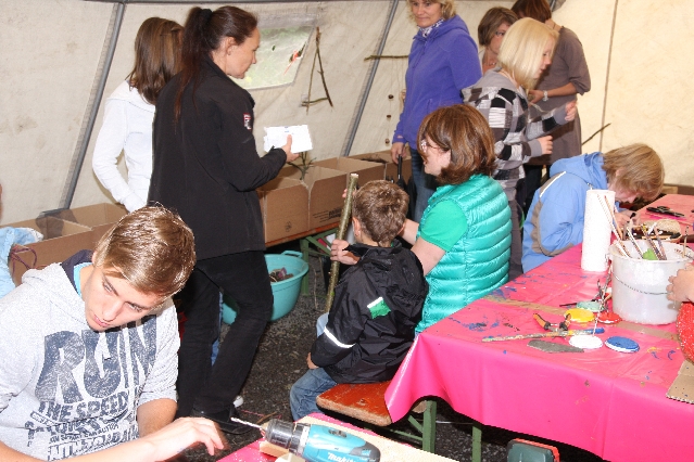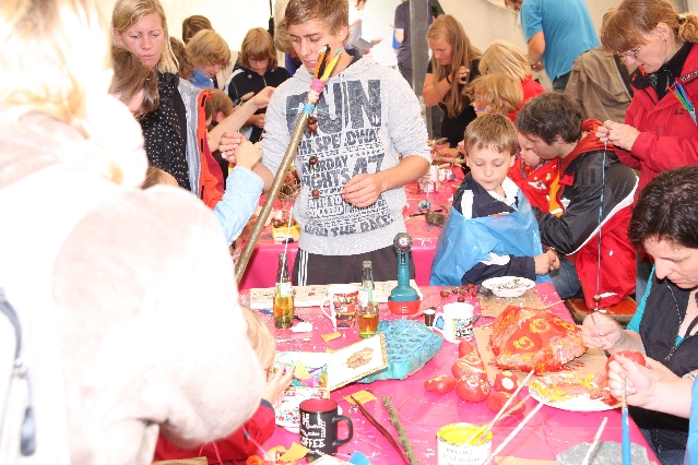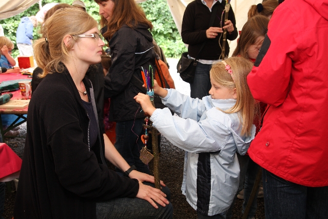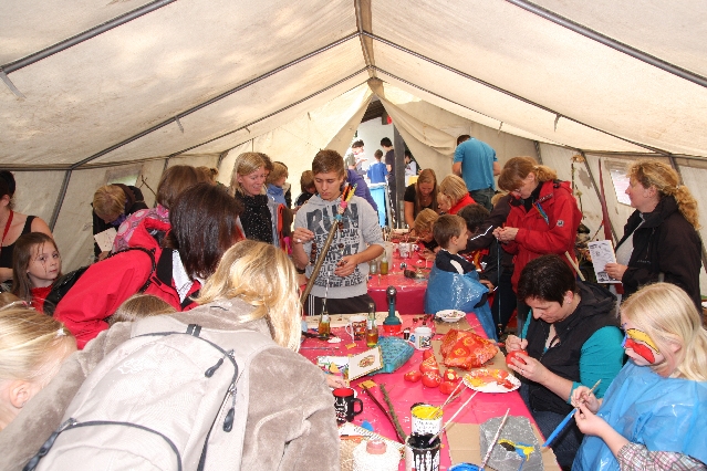 Sorgen haben sie sich gemacht, die Veranstalterinnen des KuLTour-Aktiv-Tages in Drolshagen Kalberschnacke am Listersee. Es sollte regnen, und das ist nun wirklich keine gute Voraussetzung für ein Open-Air-Event. Aber es ist ja gut gegangen, sogar sehr gut. Viele Besucher, Erwachsene und Kinder, hatten viel Spaß bei den Workshops, die am letzten Donnerstag am wunderschönen Kunst-Wanderweg am Listersee angeboten wurden. Da wurde geschnitzt, gemalt, geklebt und gestaltet. Zwischendurch mal schnell eine Stärkung: Würstchen oder Kuchen… und gleich wieder weitergearbeitet. Wer es lieber ruhiger wollte, ist die 7 km KuLTour-Weg gewandert und konnte dabei an einem Quiz teilnehmen und einen 50 Euro-Gutschein der Aktionsgemeinschaft Drolshagen e.V. gewinnen. Am Ende liefen viele kleine „Indianerkinder“ in „Friedens“-Bemalung und mit Zauberstäben johlend über die Wiesen, und auch die Eltern waren restlos zufrieden.