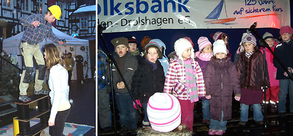 Ein festliches Programm auf der Bühne am Marktplatz sorgt für noch mehr weihnachtliche Stimmung. Da gibt es viel Musik und Aktionen. Gestartet wird am Samstag um 14.30 Uhr mit Oh Larry, dem Weihnachtsclown. Um 15.00 Uhr wir Bürgermeister Theo Hilchenbach symbolisch den „Glühwein-Anstich“ vornehmen. Um 15.45 Uhr kommt der Nikolaus und um 16 Uhr freuen sich alle auf den Kinder- und Jugendzirkus Pfiffikus aus unserer Nachbargemeinde Wenden.