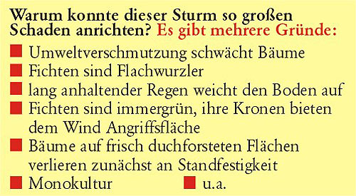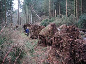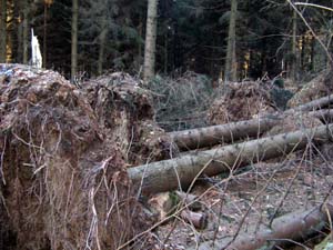 Die fallenden Stämme blockierten Straße, beschädigten Fahrzeuge und rissen zahlreiche Überlandleitungen nieder. Immer wieder wurden Autofahrer in Waldgebieten eingeschlossen und mit Ihnen auch Retter, die zu Hilfe eilen wollten. Todesopfer waren zu beklagen, und viele Waldbauern haben katastrophale finanzielle Verluste erlitten. Ganze Waldgebiete wurden von dem Orkan-Tief „Kyrill“ innerhalb weniger Minuten gefällt. 25 Millionen Bäume wurden umgeknickt oder entwurzelt – rund 50.000 Hektar Waldfläche zwischen Rhein und Weser sind betroffen.