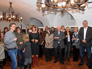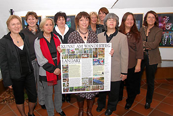 Von links nach rechts: Anne Tack, Ute Dransch, Claudia Berling, Marion Reinecke, Regine Rottwinkel, die Initiatorin, (dahinter) Gudrun Halbe, Christa Schmidt-Bender, (vorne) Mädi Hermann, Dorothea Weiss, Margot Johänntgen-Holthoff, (nicht auf dem Foto) Ruth Zeppenfeld, Ute Föge und der Fotograf Kurt Hardenacke (separates Foto) stellten Bilder und Bearbeitungen dieser LandArt-Aktion aus.