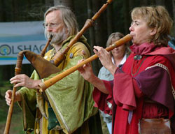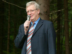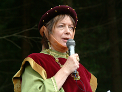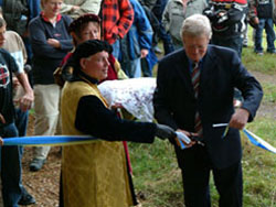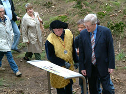 Endlich! Nach all den Mühen und der vielen Arbeit (insgesamt über 2500 Stunden) war es am 1. Oktober dann so weit. Der Wettergott hatte ein Einsehen und bei verhältnismäßig blauem Himmel fand die feierliche Einweihung statt. Die Redner wurden stilecht vom Herold Walter von der Pferdeweide (Abb.) angekündigt. Bürgermeister Theo Hilchenbach (Abb.) fand lobende Worte, vor allem für Dr. Rolf Heinen (Abb.), dem Initiator und „Vater“ des Schlüsen-Lehrpfades. Regine Rottwinkel (Abb.) bedankte sich bei all den vielen Helfern, die das Projekt erst möglich gemacht haben. Die Gruppe KURTZWEYL aus Wiehl tat das, was der Name schon sagt. Sie verbreitete mittelalterliches Flair mit Musik und Kurzweil. Dafür an dieser Stelle noch einmal recht herzliches „Seid bedankt!“.