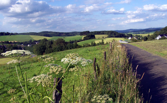 Auf der Höhe von Blockhaus kann man bei gutem Wetter im Süden das Siebengebirge sehen. Bei Hecke wird der (D)-Weg zum Grenzweg, denn hier befand sich bis ca. 1000 n. Chr. die Grenze zwischen dem christlichen Bereich im Westen und den immer noch germanischen Göttern opfernden Bewohnern des Sauerlandes. Die damalige dichte Bepflanzung gab dem Ort „Hecke“ den Namen. Auf dieser Höhe schweift der Blick weit nach Westen über das Bergische Land und nach Osten ins Sauerland. Oberhalb Belmicke blickt man erneut weit ins Oberbergische und ins Drolshagener Land. Mit mäßiger Steigung geht`s nun vorbei am Flugplatz Dümpel Richtung Norden.
