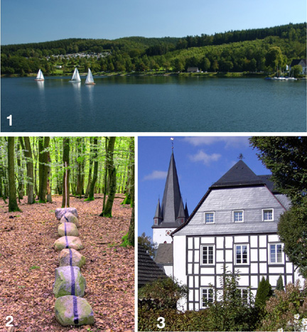 Neben den 11 A-Wegen und 2 D-Wegen gibt es im Dräulzer Land natürlich auch noch andere Wanderwege. Durch das Drolshagener Gebiet verlaufen vier X-Fernwanderwege (X3, X12, X20, X22). Sehenswert ist auch die „KuLTour“ (2) von ca. 7 km Länge in der Nähe des Listersees (1). Ebenfalls einen Besuch wert ist der Zentralort Drolshagen (3) mit einer Pfeilerbasilika aus dem 11. Jahrhundert, vielen Fachwerkhäusern, dem Alten Koster und Resten der alten Stadtmauer. (Mehr Infos über das Kloster, die Pfeilerbasilika usw. hier auf unserer Homepage unter „Tourismus/Ausflüge – Sehenswürdigkeiten. Infos über die „KulTour“ unter Suchwort: KuLTour oder Landart)