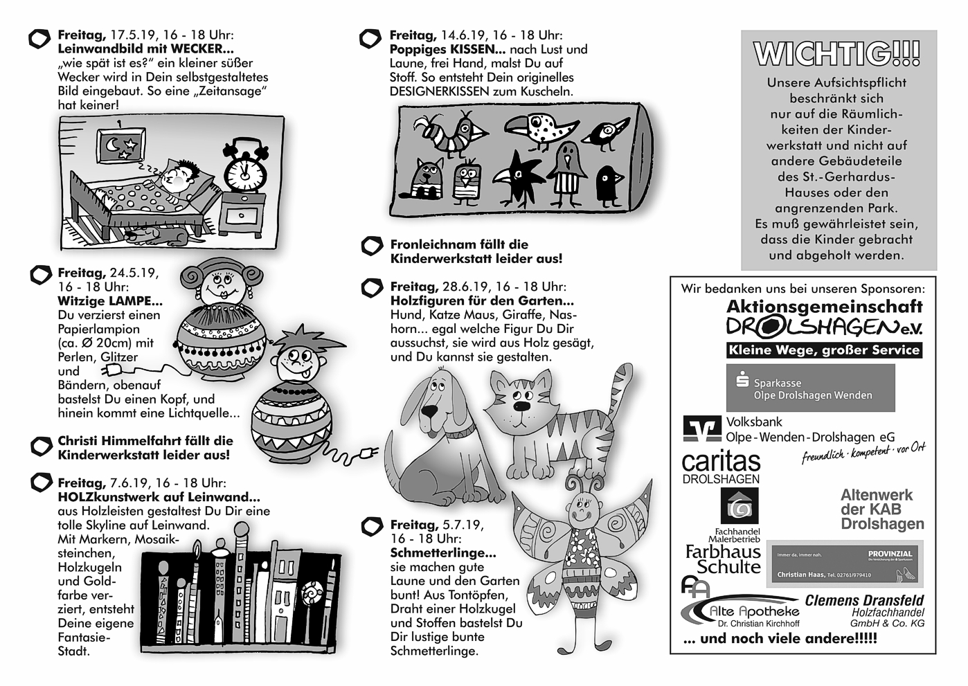 Kinderwerkstatt: Programm 17.5. bis 5.7.2019