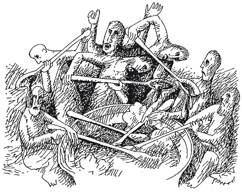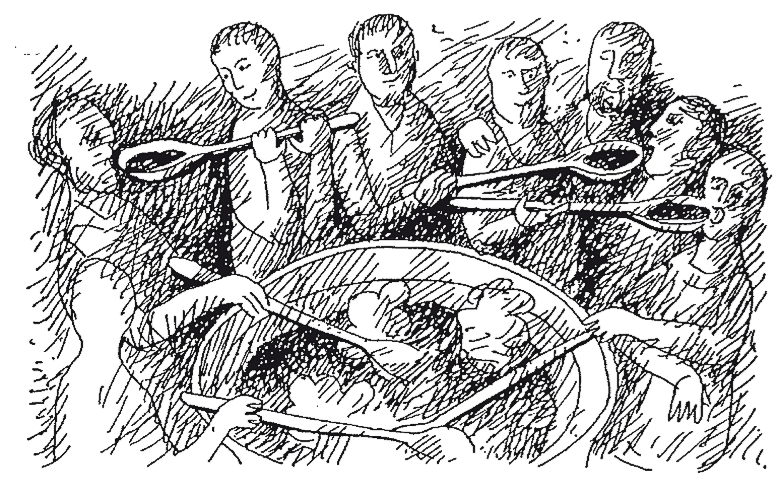 Der Prophet nimmt den Rabbi bei der Hand. Er führt ihn in einen großen Raum. Ringsum Menschen mit langen Löffeln. In der Mitte auf einem Feuer kocht ein Topf mit einem köstlichen Gericht. Alle schöpfen mit ihren langen Löffeln aus dem Topf. Aber die Menschen sehen mager aus, blass und elend. Kein Wunder: Ihre Löffel sind zu lang. Sie können sie nicht zu Munde führen. Das herrliche Essen bleibt im Topf. Die beiden gehen hinaus. »Welch seltsamer Raum war das?«, fragt der Rabbi den Propheten. »Die Hölle«, sagt Elias.