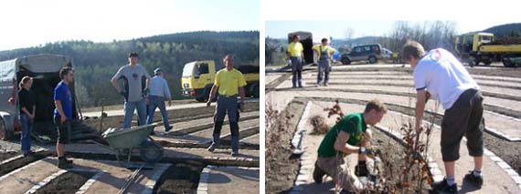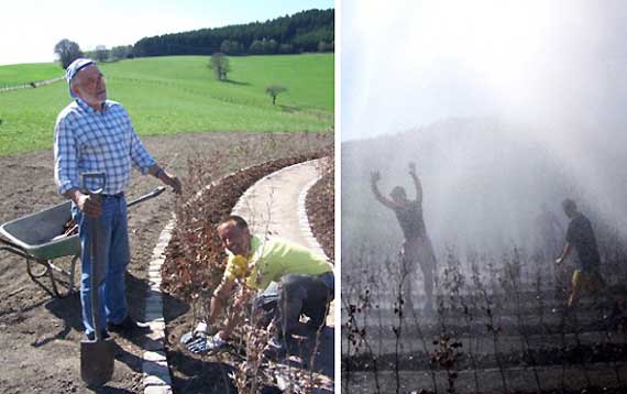 Regine Rottwinkel, Vorsitzende von Drolshagen Marketing e.V., konnte sich über viele tatkräftige Hände freuen. Eine große Gruppe Drolshagener Jugendlicher, die sich ursprünglich zum Weltjugendtag 2005 zusammengefunden hatten sowie Hans Mähler und sein Bruder Wilhelm und einige junge Leute von Stupperhof gehörten zu den wirklich fleißigen Helfern, die stundenlang in der doch sehr kräftigen Aprilsonne 2000 Pflanzen in den Boden brachten. Damit die Arbeiten sich in Grenzen halten, wurde bewusst auf die Rotbuche zurückgegriffen. Diese Pflanze hat den Vorteil, dass sie in der Regel nur einmal im Jahr beschnitten werden muss. Am Ende des langen Tages kam die Drolshagener Feuerwehr um die kleinen Pflänzchen ordentlich zu gießen. Aber noch ist das Labyrinth nicht fertig. Viele Kleinigkeiten müssen noch getan werden. Auch braucht es noch einen passenden Mittelpunkt. Wenn dann alles geschafft ist, dann wird es eine schöne Labyrinth-Einweihungsparty geben.