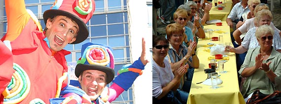 Um ca. 13.15 Uhr wird es richtig schön bunt. Die ComedyArtisten von Chapeau Bas präsentieren ein sprühendes Intermezzo artistisch-komödiantischer Höchstleistungen. Jonglage, Hochradartistik, Feuriges und Zauberhaftes bringen Stefan und Gerhard dank wortgewandter Moderation und Comedy unter einen Hut. Den Hut zieht Chapeau Bas für alle großen und kleinen Zuschauer, wenn es heißt „Manege frei“! Das Publikum darf gespannt sein auf ein abwechslungsreiches Programm aus Jonglage, Comedy, Zauberei, Hochrad- und Feuerartistik. In der Show verbindet die Dramaturgie der Zufälligkeiten hochkarätige Artistik mit grenzenloser Spontaneität – zum Zuschauen und Mitmischen! Dabei entdeckt Chapeau Bas auch unter den Gästen und Zuschauern bislang unerkannte Show-Talente…