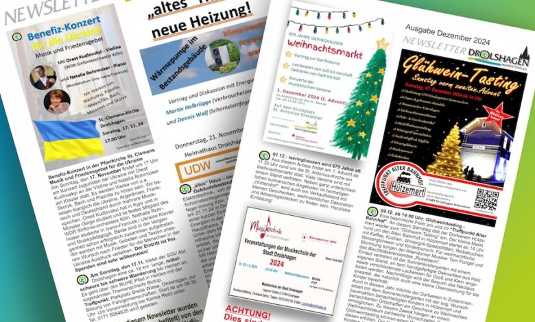 hier ist nun der neue Newsletter mit Infos und Terminen für den Dezember 2024. Wer noch Infos für Januar 2025  hat, bitte bis zum 15. Dezember mailen. (Gerne auch mit Bild) Sie können auch schon alle weiteren Termine, die für 2025 feststehen, mitschicken. Die Termine werde ich natürlich auch in den Onlinekalender von Drolshagen Marketing e. V. übernehmen. Gerne werde ich auch Ihre Vereinsvorstellung oder sonstige News einbinden.