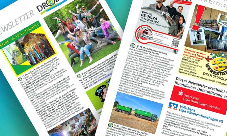 hier ist nun der neue Newsletter mit Infos und Terminen für den Oktober 2024. Der November 2024 wird folgen. Wer noch Infos für diesen Monat hat, bitte bis zum 15. Oktober mailen. (Gerne auch mit Bild) Sie können auch schon alle weiteren Termine, die für 2024 feststehen, mitschicken. Die Termine werde ich natürlich auch in den Onlinekalender von Drolshagen Marketing e. V. übernehmen. Gerne werde ich auch Ihre Vereinsvorstellung oder sonstige News einbinden.