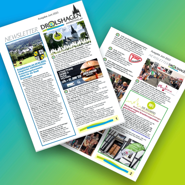 hier ist nun der neue Newsletter mit Infos und Terminen für den September 2018. Der Oktober 2018 wird folgen. Wer noch Infos für diesen Monat hat, bitte bis zum 15. September mailen. (Gerne auch mit Bild) Sie können auch schon alle Termine, die für 2018 feststehen, mitschicken. Die Termine werde ich natürlich auch in den Onlinekalender von Drolshagen Marketing e. V. übernehmen. (Die Stadt verlinkt auf diesen Kalender.) Gerne werde ich auch Ihre Vereinsvorstellung oder sonstige News einbinden. Hier der Link zum Newsletter: newsletter09_18X