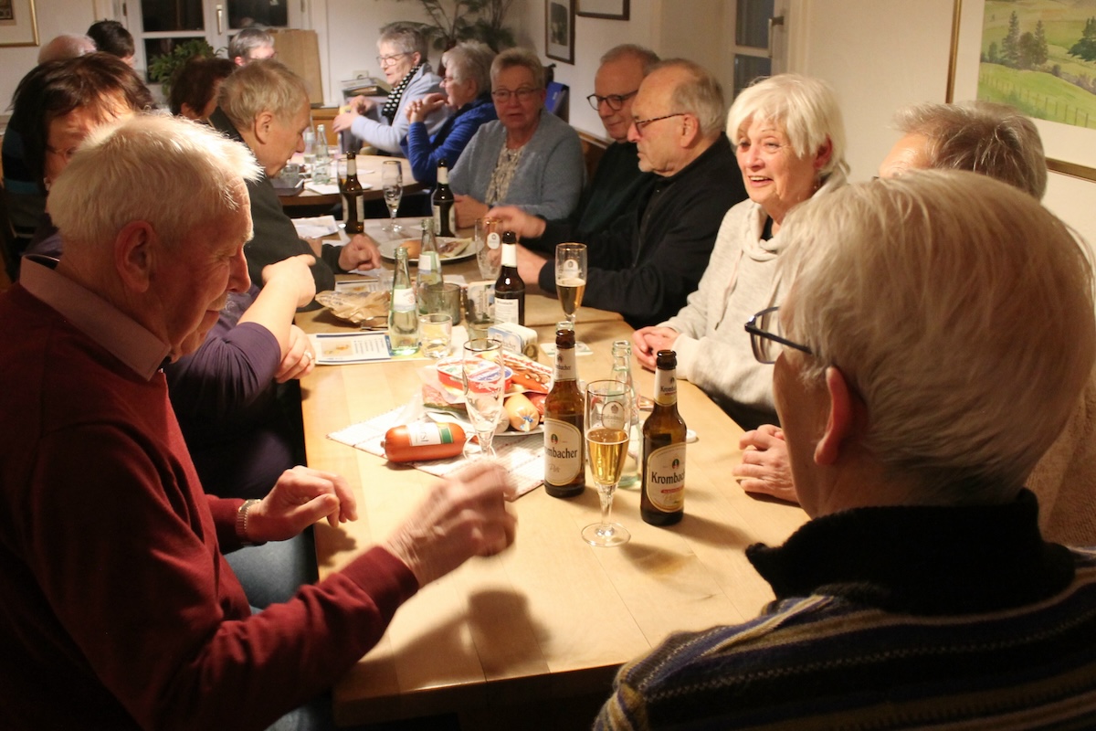 Tags drauf füllte sich die Gaststube des Heimathauses wieder mit den Mitgliedern der Plattdeutschen Runde zum alljährlichen Wöaste-Dubbeln, dem Knobeln um Würste der heimischen Metzgereien und die Schnalhüseken, den traditionellen Hefeschnecken der Eichener Mühle. Wie immer ging es um die Wurst. Diesen seit langen Jahren überkommenen Drolshagener Brauch, zur Jahreswende in geselliger Runde um Würste zu knobeln, hatte die Plattdeutsche Runde schon vor vielen Jahren wieder aufgegriffen und führt ihn alljährlich zur großen Freude aller Beteilgten durch. Die Lautstärke der Aufforderungen, der von Überraschung und Zustimmung geprägten Rufe spiegelte die ausgelassene Stimmung gut wieder. Zwar gingen einige mit wenigen, andere mit eine Tasche voll Würste nach Hause. Es war eben ein Spiel, bei dem man gewinnen, aber auch verlieren konnte.
