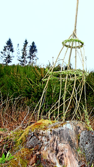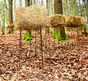 Entstanden sind Bauminstallationen, Steinbogen, galoppierende Strohhaufen, ein Ort der Auseinandersetzung, Naturgewebe, bemooste Gebilde usw. Da diese Werke mit Naturmaterialien gebaut wurden, waren sie natürlich im Laufe der Monate dem natürlichen Verfall ausgesetzt. So sind z.B. die galoppierenden Strohhaufen von ihren Beinen gefallen und mußten erneuert werden.