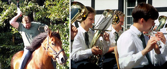 Die Drolshagener sind aufgeschlossene Menschen, die gerne feiern. Tradition und Brauchtum werden bewahrt und gepflegt: Angefangen beim Neujahrsansingen über die unvergleichliche Dräulzer Weiberfastnacht (Abb. 1), die Volks- und Heimatfeste, wie das Ernte- und Tierschaufest (Abb. 2), der Landfrauenkaffee, das Gänsereiten in Bühren (Abb. 3), Sänger- und Musikfeste (Abb. 4) bis hin zu sieben stolzen Schützenfesten. Das Jahr hindurch finden in Drolshagen und auf den Dörfern kleine und große Feierlichkeiten statt. Stellvertretend für die zahlreichen kirchlichen Bräuche seien der Sendschotter und der Iseringhauser Umgang erwähnt.