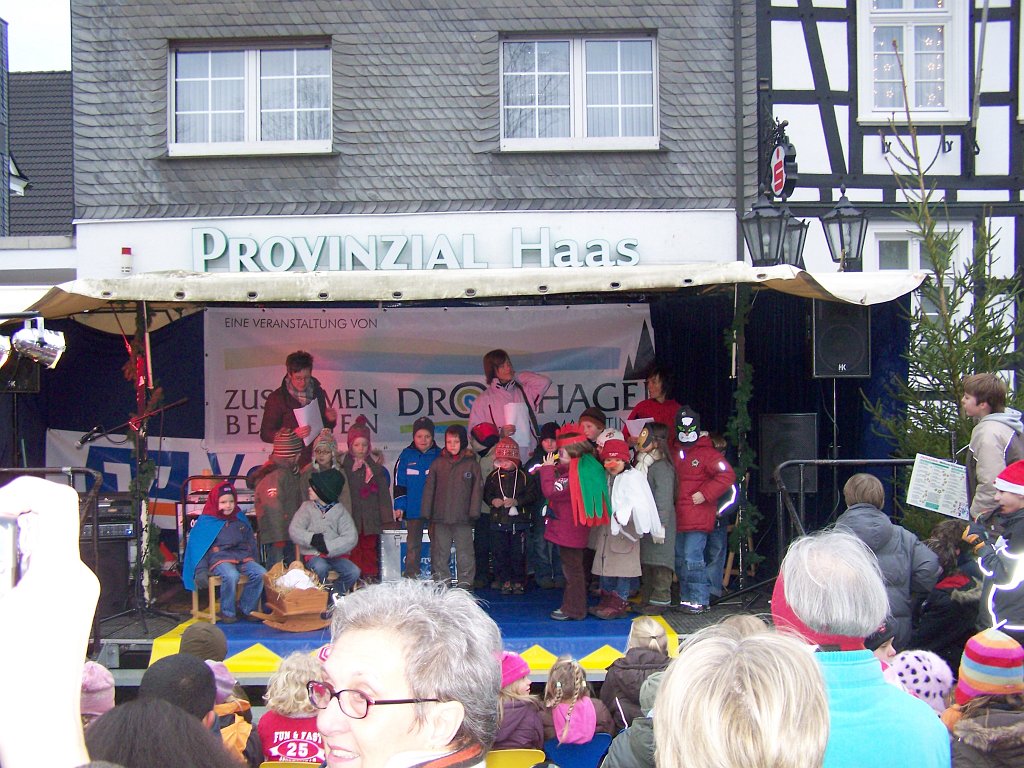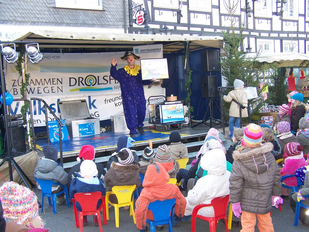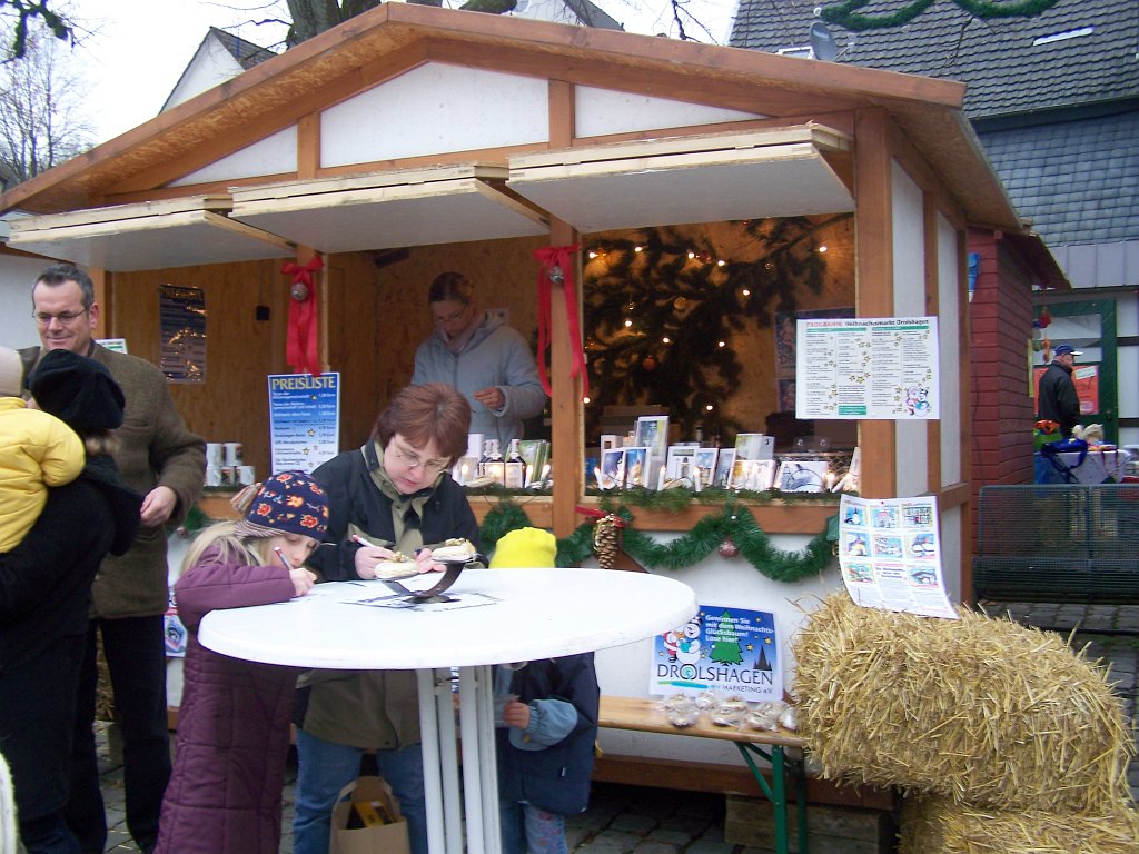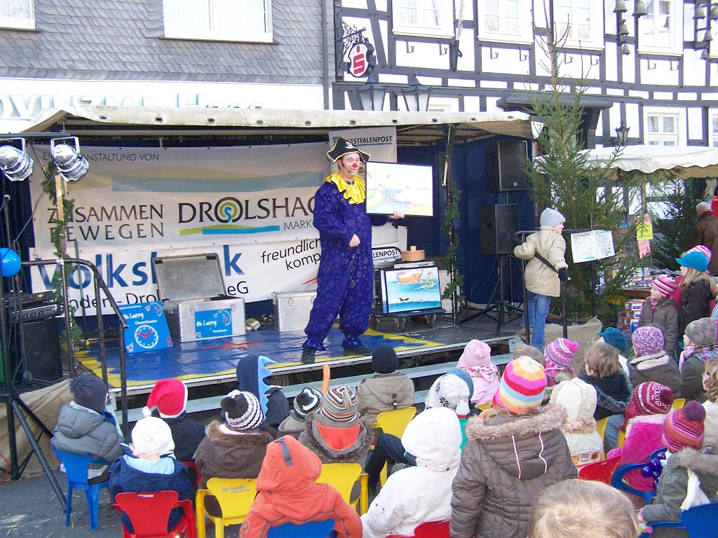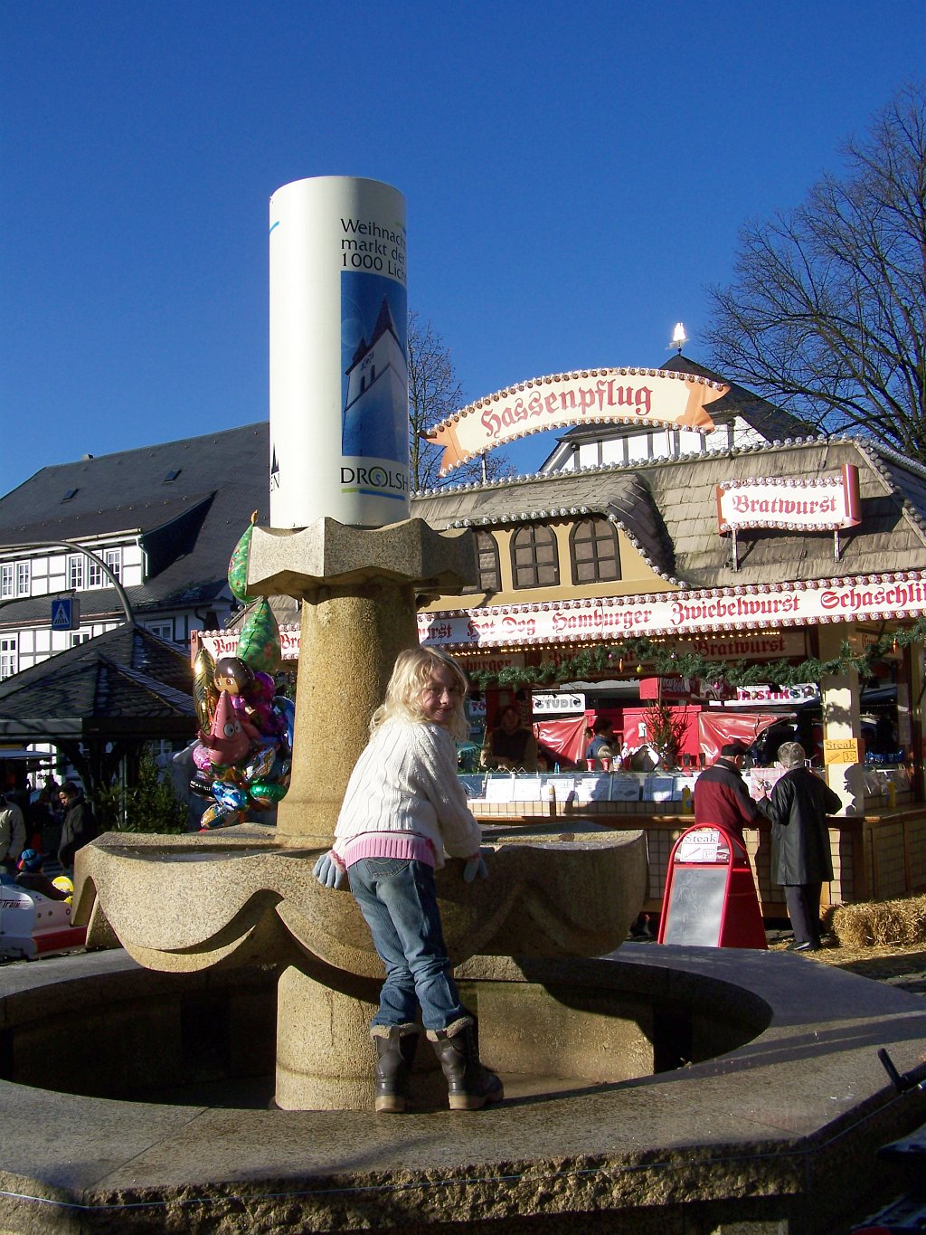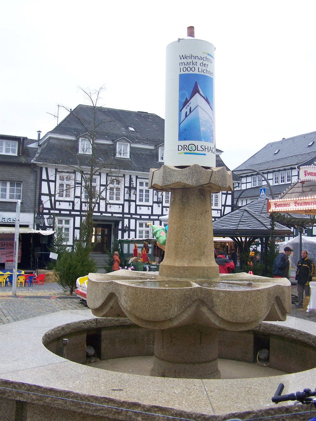 Von alten Fachwerkhäusern umrahmt, bewacht vom gewaltigen Turm der St.Clemens-Basilika, ist der Drolshagener Marktplatz wie geschaffen für einen gemütlichen Weihnachtsbummel. Eine 1,50 m große Kerze wurde auf den Brunnen des Marktplatzes gesetzt und war eine zusätzliche Attraktion. In diesem stilvollen Ambiente fand, wie jedes Jahr am Wochenende des dritten Advents in Drolshagen ein ganz besonderer Weihnachtsmarkt statt.